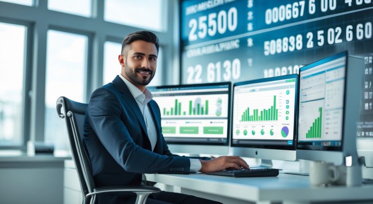 Seorang profesional di kantor modern sedang menganalisis data pada beberapa layar komputer dengan grafik dan angka.