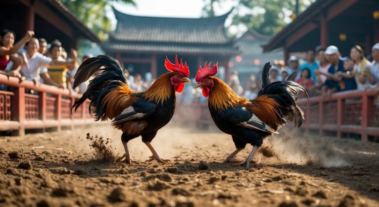 Dua ayam bertarung di arena sabung ayam dengan penonton yang antusias mengelilingi, suasana penuh semangat dan ramai.